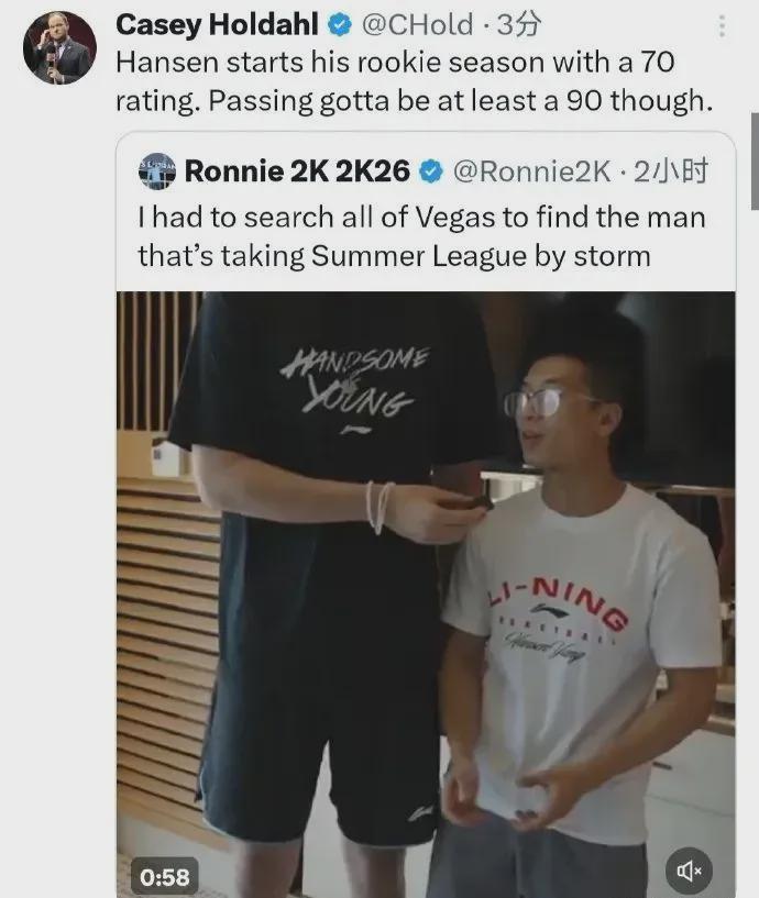 开拓者队记对此表示:杨瀚森的传球能力值至少要达到90才行。